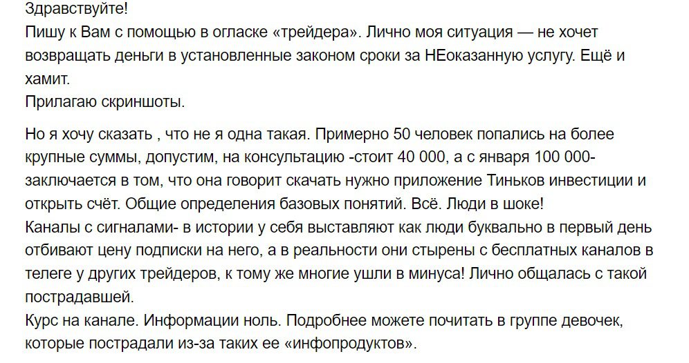 Судя по отзывам, трейдинг канал wustova – обычный лохотрон, подписка на который абсолютно бесполезна для начинающих и опытных трейдеров. Чего только стоит консультация девушки, которая не подтверждает своей квалификации, образования и даже наличия документов на основной вид деятельности, за 50 000 рублей. Пользователям просто предлагают переводить деньги незнакомому человеку, не предоставляя взамен никаких гарантий.