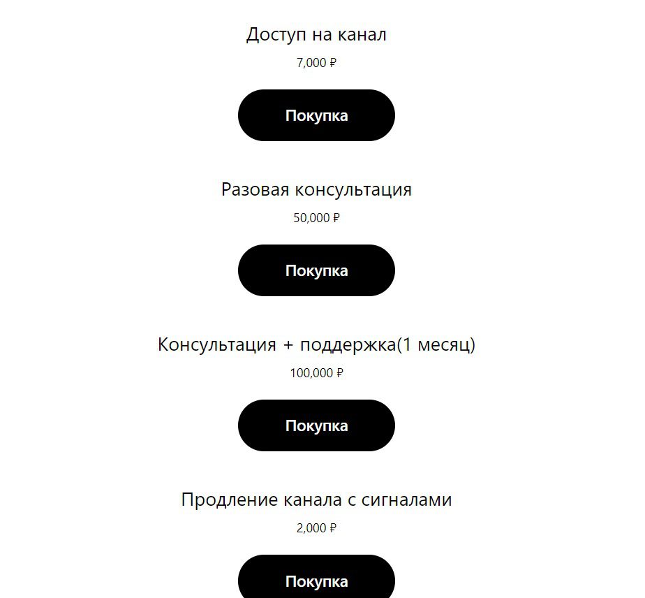 Опытным трейдерам давно известно, что для выхода на доход путем спекуляции на бирже требуется много времени, усилий и знаний. Любые обещания легкой и быстрой прибыли являются мошенничеством и обманом.На момент написания обзора автор проекта предлагала воспользоваться следующими услугами: