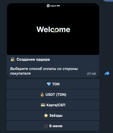В телеграм-боте «Лагуна Гифт» заявлена поддержка всех наиболее распространенных платежных методов: токены TON и USDT в сети TON, Telegram Stars, а также рублевые банковские карты.
