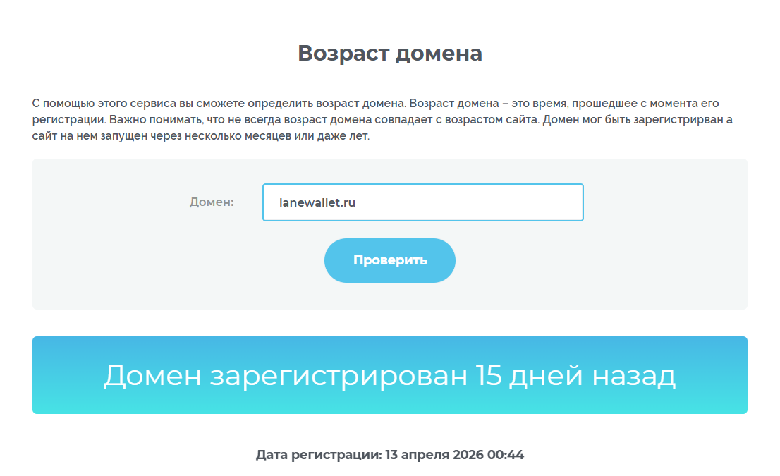 Lanewallet – совсем молодой сервис. Зарегистрирована платформа была в апреле 2026 года. На момент обзора сайт существует всего 15 дней. Причем спустя две недели работы платформа почему-то уже недоступна.