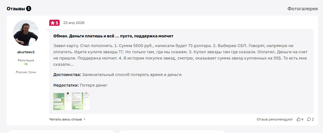 О платформе lanewallet ru отзывы в сети немногочисленны. Если быть точными, то нам удалось найти в сети только один комментарий от пользователя. Он пишет, что сервис является мошенническим и не рекомендует сотрудничать с ним. Клиент рассказывает, что оформил на сайте виртуальную карту, внес на ее счет 5500 рублей. К зачислению было указано 73 доллара. Оплата через СБП на сайте невозможна, поэтому пользователей отправляют покупать телеграм-звезды, причем через определенный проект. После покупки выясняется, что на ту же сумму пользователю будет доступно всего 55 долларов, поскольку все остальное забирается в качестве комиссии. Но самое интересное, что даже эта сумма на счет не поступает.