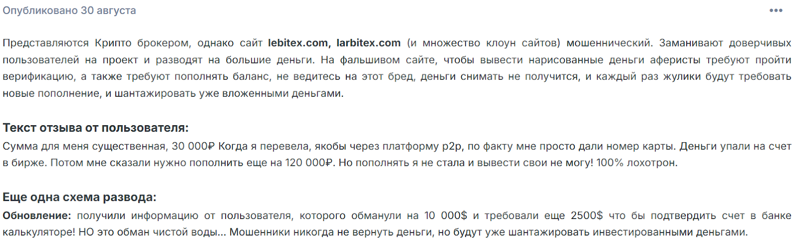 Анализ деятельности Larbitex выявил проблемы, которые делают сотрудничество с платформой опасным. Среди недостатков можно выделить обман: