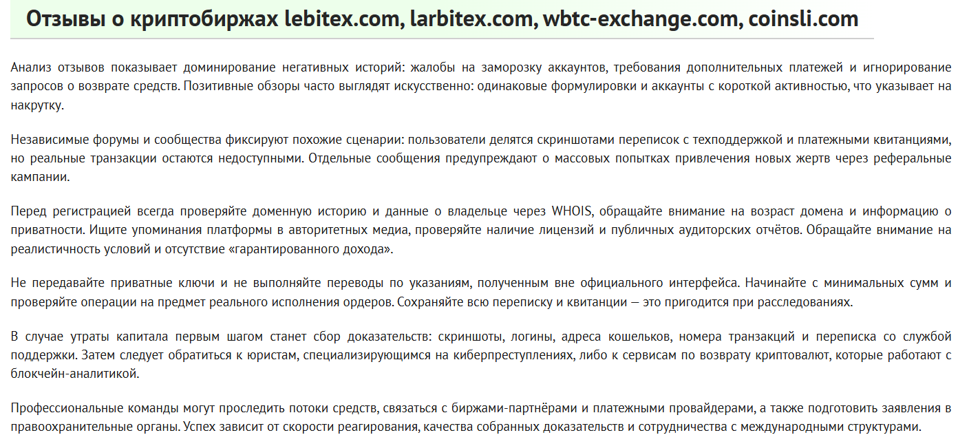 Мы рекомендуем проявлять осторожность при рассмотрении сотрудничества с Larbitex. Риск утраты средств и утечки данных делает использование биржи небезопасным. Если у вас есть опыт взаимодействия с биржей, поделитесь им в комментариях.