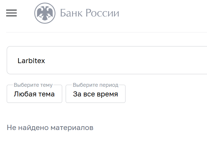 Larbitex упоминает раздел «Регулирование и лицензии». Но он содержит лишь общие фразы, без ссылок на органы. В реальности нет подтверждений, что платформа подчиняется финансовому надзору. Организация не фигурирует в списках регулируемых бирж и реестрах крипторегуляторов. Центральный Банка РФ не выявил никаких упоминаний о бирже. Деятельность проекта на территории России не является законной.
