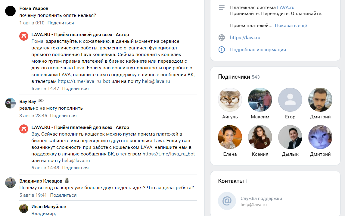 Проект имеет сравнительно небольшую аудиторию: 1 000 подписчиков в Telegram и 500 в группе ВК. Положительной репутацией сервис явно не обладает, судя по количеству негативных отзывов в интернете о платежной системе «Лава».