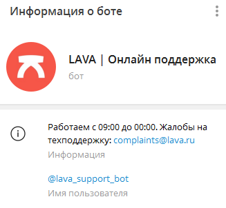 В профиле бота поддержки закреплена ссылка на электронный адрес почты Complaints lava ru для подачи «жалоб на техподдержку».