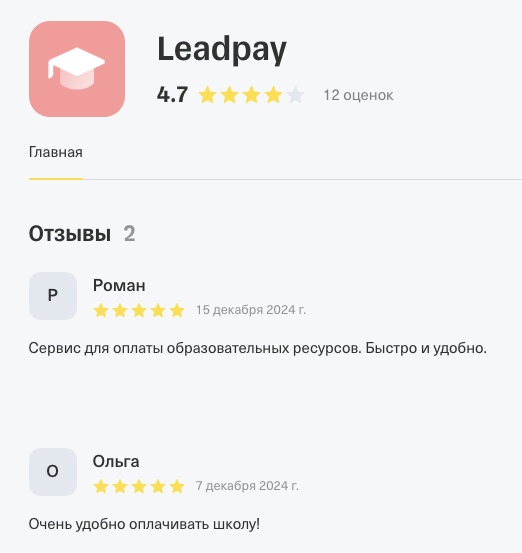 Отзывы о «ЛидПэй» удалось найти на сервисе «Отзывы о компания» компании T-Bank. В них утверждают, что данная платформа удобна для оплаты курсов и школ. Средний рейтинг платежной системы, который рассчитан на основе 12 оценок, составляет 4,7 балла.