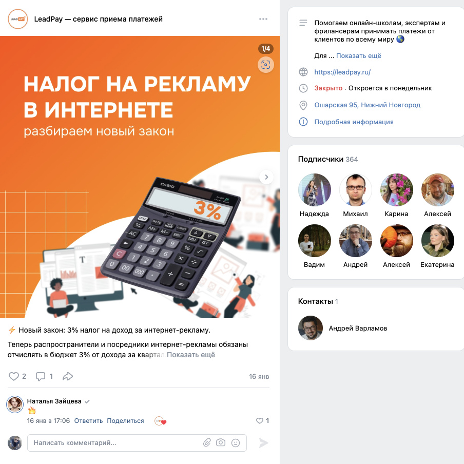 На страницу «LeadPay Сервис приема платежей», lead pay подписано 364 человека. Посты собирают в среднем по 2-3 лайка.