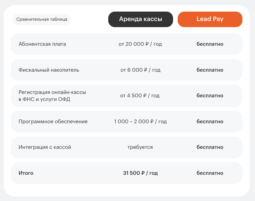 Одна из фишек данной платежной системы — это именно онлайн-касса. Владельцы платформы преподносят ее как бесплатную замену обычному оборудованию. Как заявлено, использование LeadPay позволяет сэкономить 31,5 тысяч рублей в год.