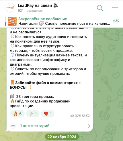 На телеграмм-канал LeadPay на связи», на 25 января 2025-го года, подписан 921 пользователей. Публикации просматривают в среднем по 300 раз.