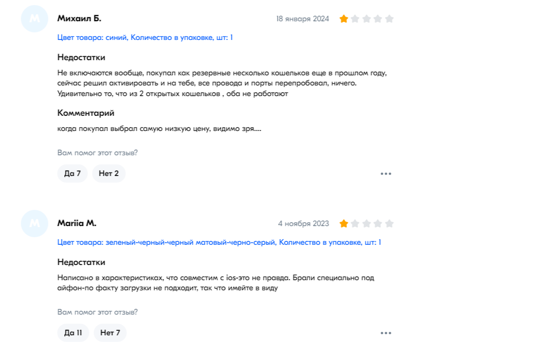 Большинство негативных отзывов связано с заводским браком изделий и недоукомплектации товара. Иногда кошелек просто не включается, часто возникают проблемы с работой зарядного устройства и аккумулятора.