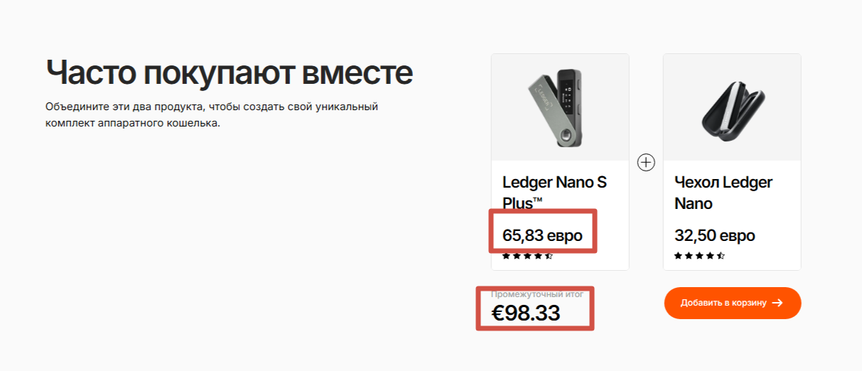 Цены на Ledger Nano S Plus зависят от комплектации и продавцов-посредников. На фирменном сайте холодный кошелек Ledger Nano S и оригинальный чехол можно купить за 98,33 евро. Доставка не входит в эту сумму. Маркетплейсы предлагают девайс от 15 00 до 20 000 рублей. Размер итоговой стоимости связан с доставкой, сопутствующими услугами или товарами. Часто продавцы в качестве подарка вкладывают чехол для кошелька или брелок.