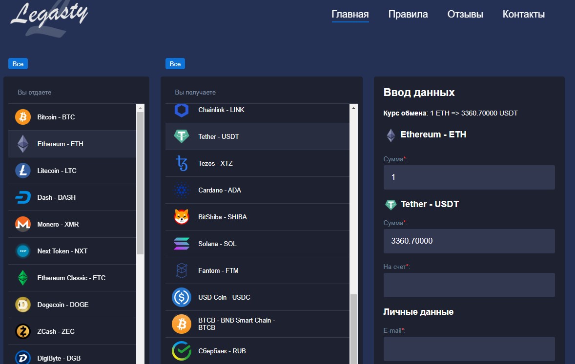 Legasty com отзывы о котором остались только в негативном ключе, — криптовалютный обменник с минимумом доступной о нем информации в интернете.. Владельцы обещают поддержку десятков криптовалют и карт нескольких российских банков.