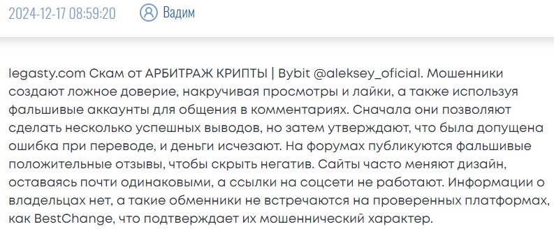 В интернете много отзывов об обменниках этой сети, но о Legasty отзыв только один. Пользователь подтверждает, что его разводили через Телеграм-канал об арбитраже криптовалюты.