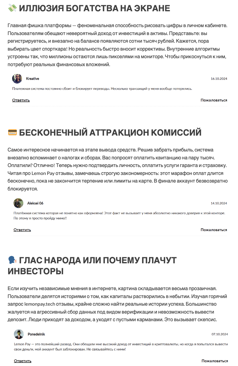 Фидбэк о платформе довольно слабый, что говорит о невысокой востребованности платежной системы. В русскоязычном сегменте интернета отзывы о Lemon Pay исключительно отрицательные.