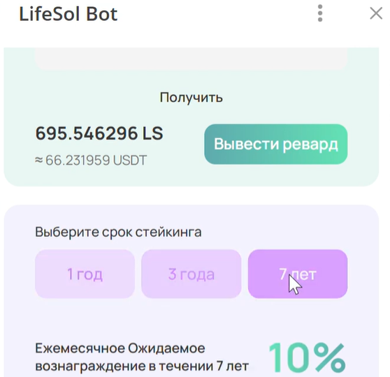 Прибыль, которую начисляет кошелек Lifesol, варьируется от 6% при инвестициях на год до 10% при заморозке крипты на аккаунте на 7 лет. Клиентам Лайф Сол обещают, что они могут вывести заработанные монеты в любой момент на другой кошелек.