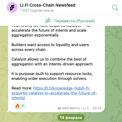 На телеграмм-канал LI FI Cross Chain Newsfeed, lifinews, на 26 февраля 2025-го года, подписано около 1,94 тысяч пользователей. Публикации собирают в среднем по 500-700 просмотров.Комментарии на телеграм-канале отключены. Посты собирают в среднем по 5-12 реакций от читателей.