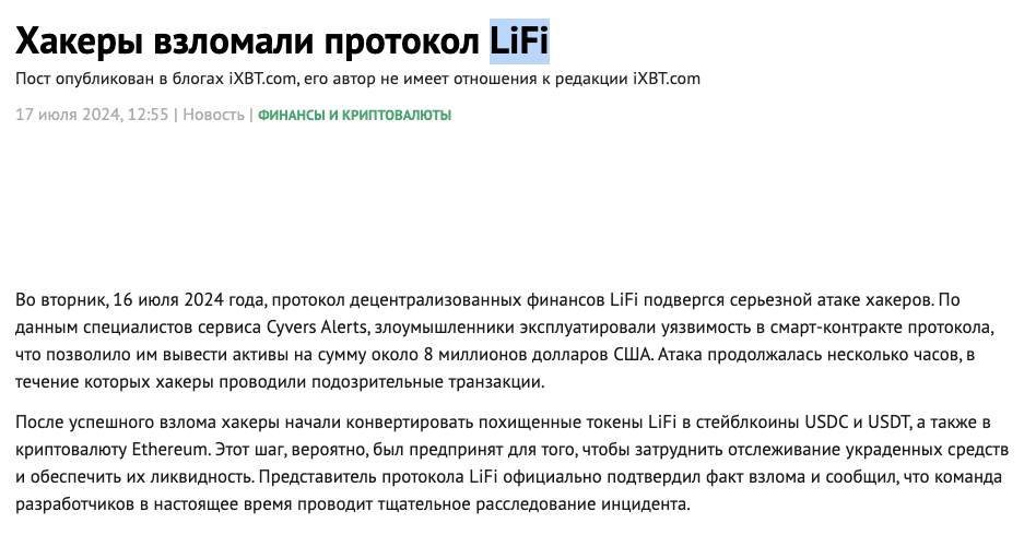 В интернете есть информация о том, что летом 2024-го года хакеры взломали протокол «Лай Фай». В этом материале указано, что злоумышленники похитили токены LiFi и смогли конвертировать их в другие монеты. Подозреваем, что в данной новости есть ошибка. Вероятно, были взломаны кошельки компании, в результате чего хакеры украли крипту, которую участвующие в предпродаже люди использовали для покупки монет «Лай Фай».
