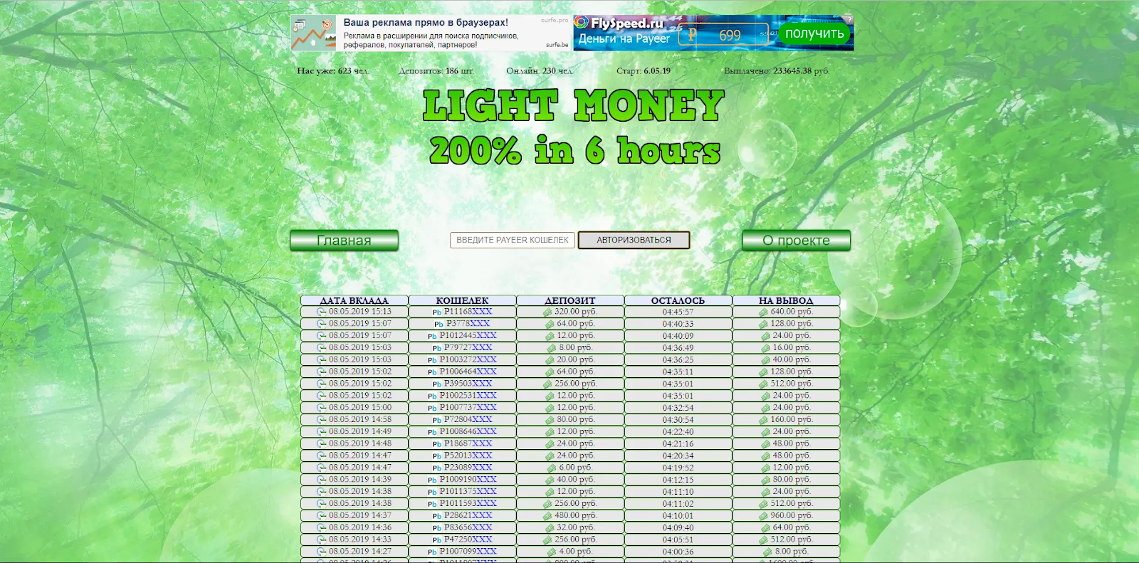 Light Money – это сервис для заработка в интернете. Анонимные основатели проекта гарантируют доход 200% за 6 часов без каких-либо финансовых рисков. В обзоре проанализируем, как именно предлагает зарабатывать сервис, и что говорят о нём реальные пользователи.