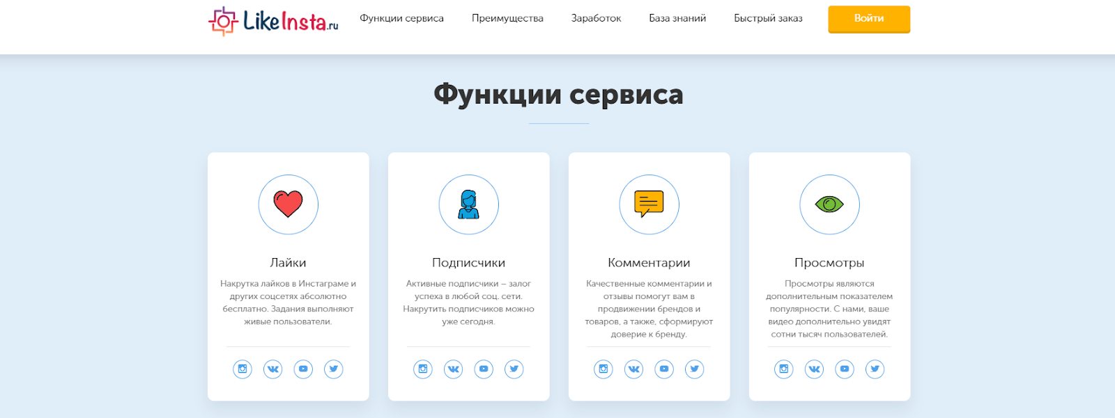 Основной функционал ресурса Инста Лайк это накрутка аудитории на таких площадках, как Instagram и Вконтакте, YouTube и Twitter. При этом купить пользователей в телеграм / Facebook сообщества невозможно. Вдобавок на Like Insta ru можно воспользоваться бесплатной накруткой, что достаточно странно, ведь никто из пользователей не будет подписываться на ресурс без вознаграждения.