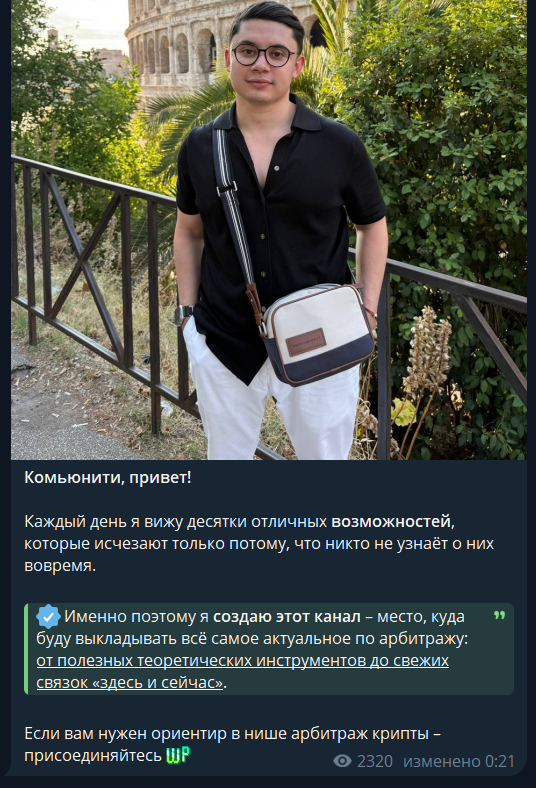 На канале 16 400 подписчиков, посты набирают много просмотров, аудитория не выглядит накрученной ботами. На канале публикуются фото некоего человека, но нет подтверждений, что он имеет отношение к этому проекту. Видео, на которых он говорил бы об арбитраже, нет. Владелец канала представляется Максимом Перепелицей.