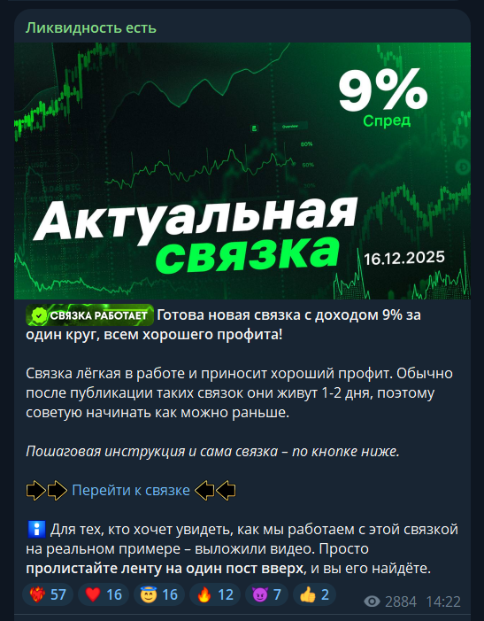 Ликвидность есть — канал в Телеграмме, который ведет владелец арбитражной команды. Он утверждает, что стабильно зарабатывает на арбитраже и готов просто так давать связки своим подписчикам. Рассмотрим, как устроен проект Ликвидность есть и стоит ли с ним связываться.