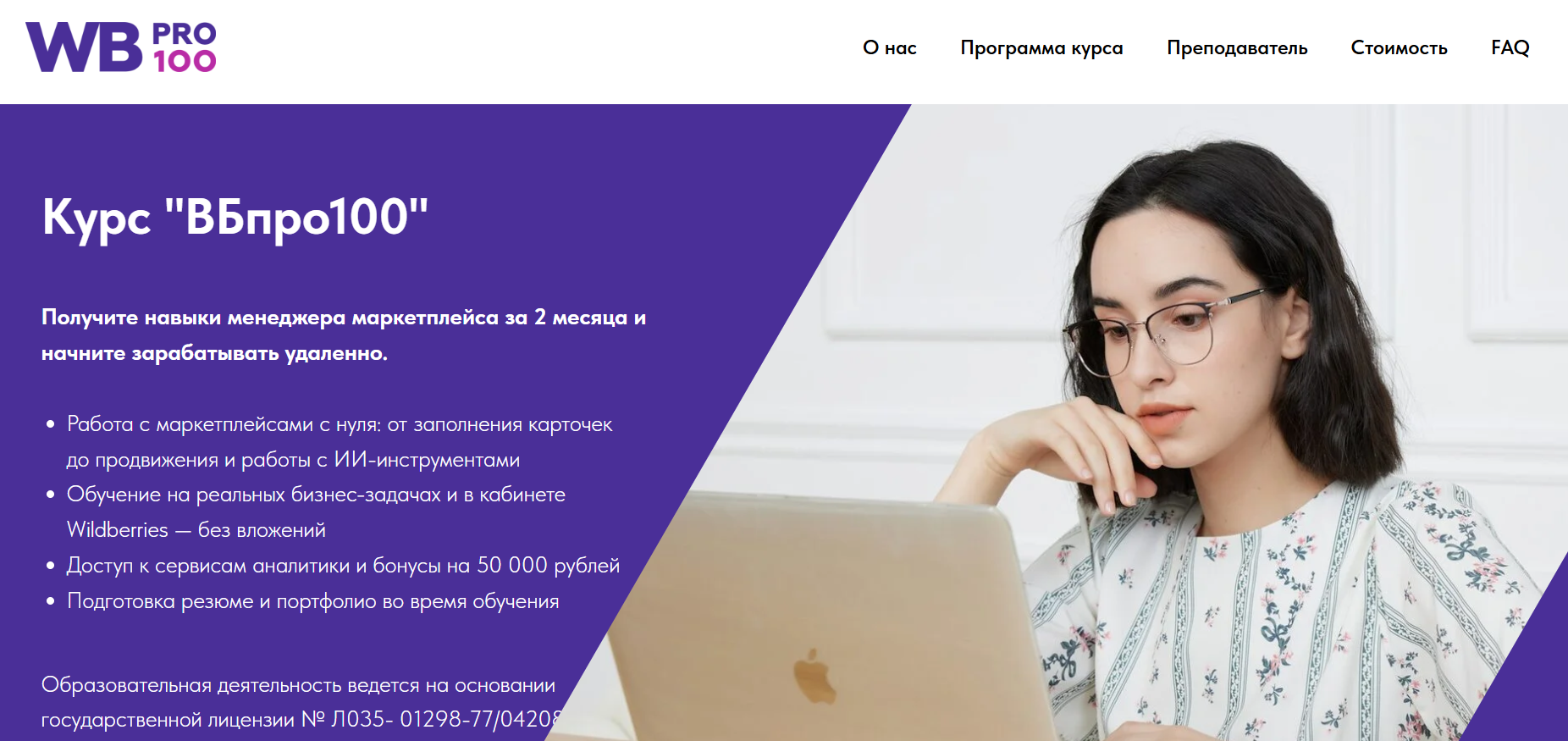 На сайте публикуются отзывы о курсах Вбпро100, а также прочие данные, связанные с обучением. На главной странице указана лицензия для ведения образовательной деятельности. Курс включает в себя 9 модулей, которые проходятся в течение двух месяцев. Все это рассчитано на 54 часа изучения. В программу входят: