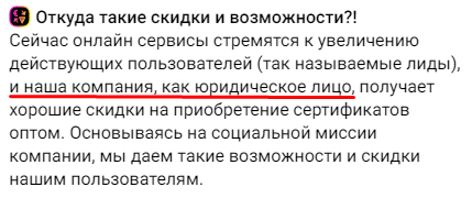 К плюсам проекта можно отнести обилие промо-материалов, гайдов и инструкций. Разъясняя в одном из постов, откуда такие скидки и возможности, администрация указывает: наша компания как юридическое лицо приобретает сертификаты оптом. Несмотря на иллюзорную открытость и проведение ряда AMA–сессий, упомянутое юридическое лицо на канале остается безымянным.