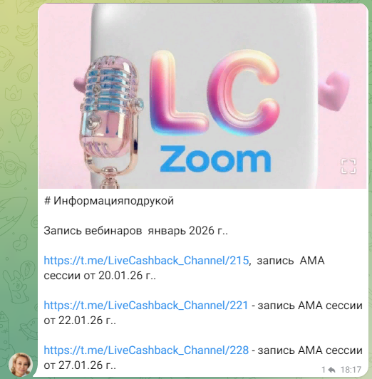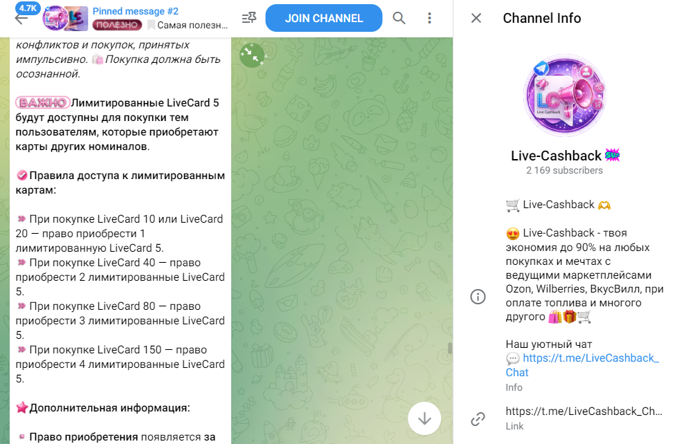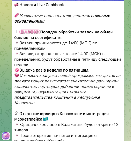 • официальный Telegram-канал Live-Cashback, @ LiveCashback Channel;