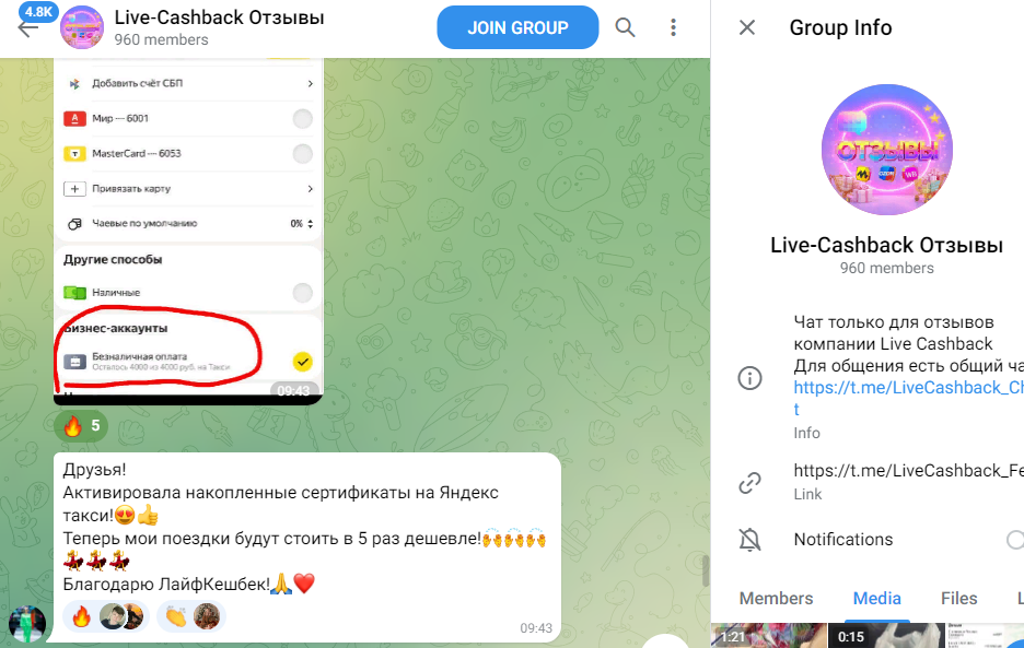 В чате с отзывами Live cash back Отзывы состоит 960 участников. Комментарии действительно оставляют различные юзеры, которые делятся своими покупками, оплаченными сертификатами.