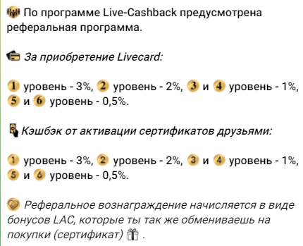 У проекта также работает шестиуровневая реферальная программа, участвуя в которой можно получить кэшбэк и бонусы. Обязательным условием является наличие как минимум одной карты на любую сумму. Проценты начисляются как за приобретение друзьями карты, так и за активацию сертификатов. Бонусы для уровня двух типов наград одинаковые – составляют от 3% до 0,5% в зависимости от уровня реферала.