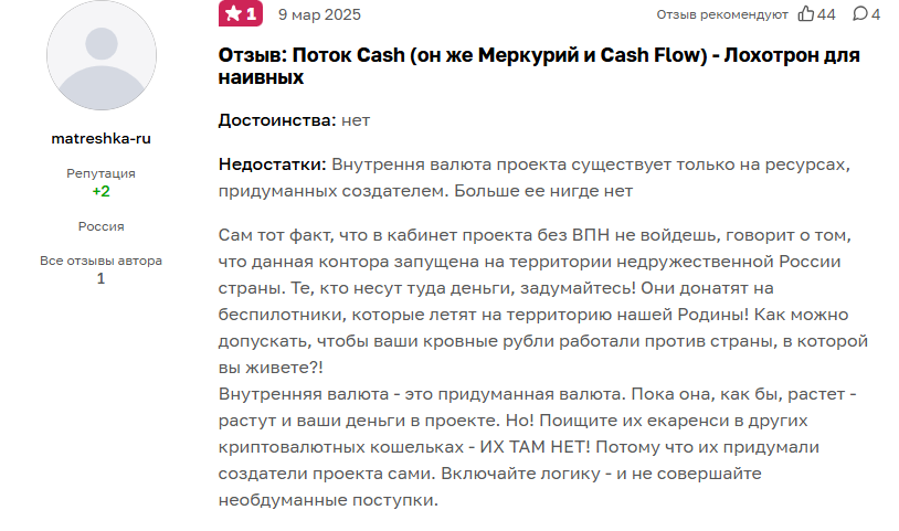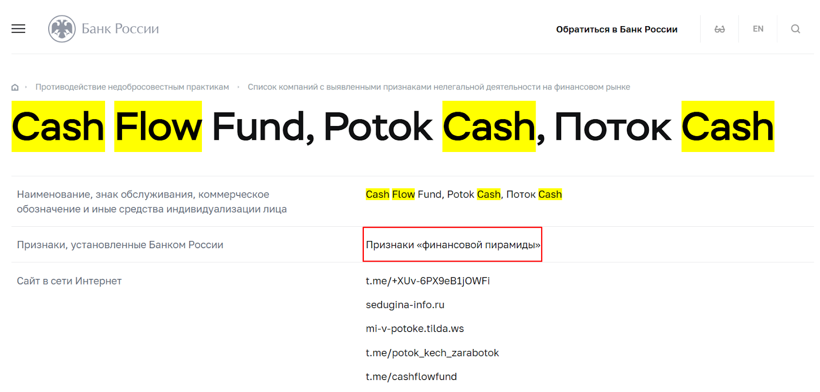 Платформу CashFlow мы называем пирамидой неспроста: деятельность этой организации в России запрещена еще с сентября 2021 года. С тех пор лохотрон неоднократно менял свое название «Поток Cash», Cash Life и так далее.
