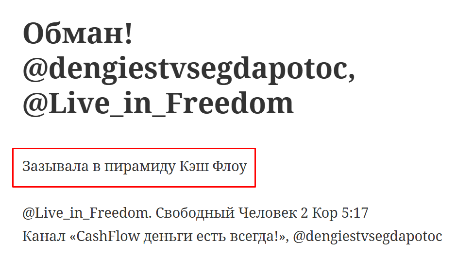 Хотя «Поток Cash» и прочие вариации пирамиды CashFlow давно признаны мошенническими, даже в 2026 году находятся те, кто верит в сказки от автора телеграмм-канала Live in Freedom. Как правило, это возрастная аудитория, которая лишена критического мышления. Например, пенсионеры охотно заходят в пирамиду, доверяя обещаниям мошенника. Тем более, сказочник Роман прикрывается Богом, публикуя цитаты из Библии и благодаря его за помощь.