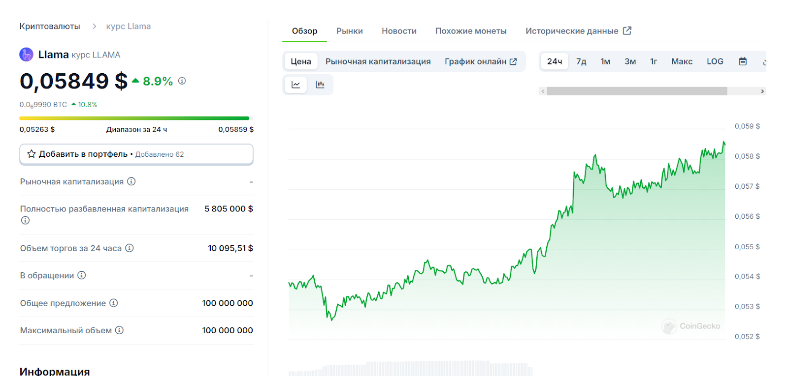 - Текущий курс крипты Ллама (Llama) — составляет 0,05849 долларов