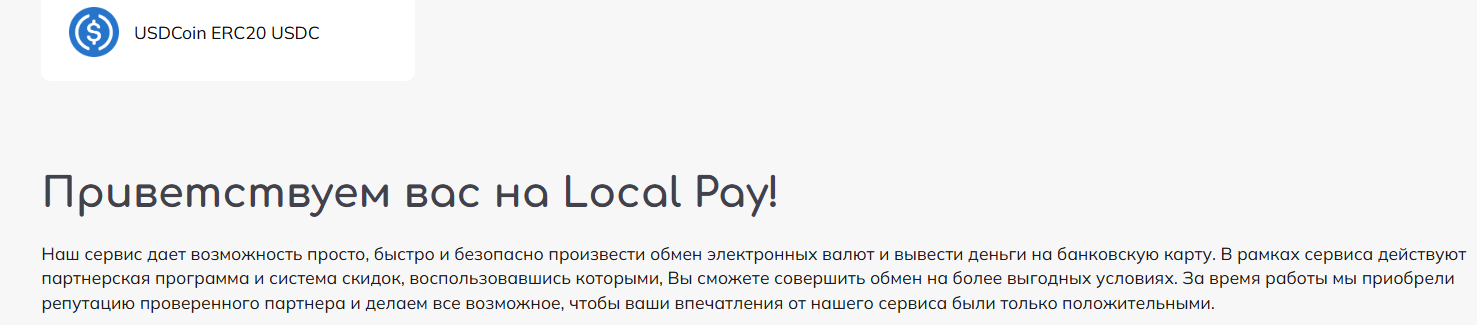 Localpay представляют как отечественный обменник, который позволяет перевести деньги с криптовалютного или электронного wallet на карту банка. Для жителей Москвы и Санкт-Петербурга действует услуга по доставке наличных курьером.