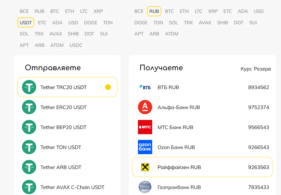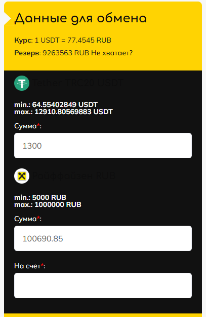 Обмен валюты проводится в ручном и полуавтоматическом режиме. На главной странице сайта нужно выбрать направление обмена и указать сумму. Автоматически будет рассчитано, сколько денег поступит на счет. Также в форме приводится актуальный курс и резерв.