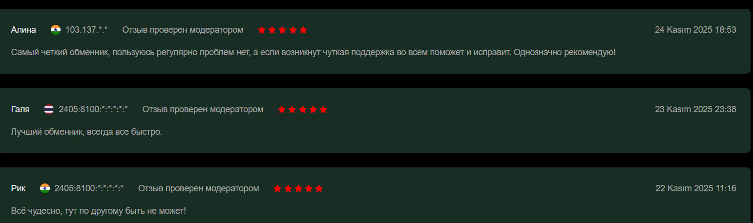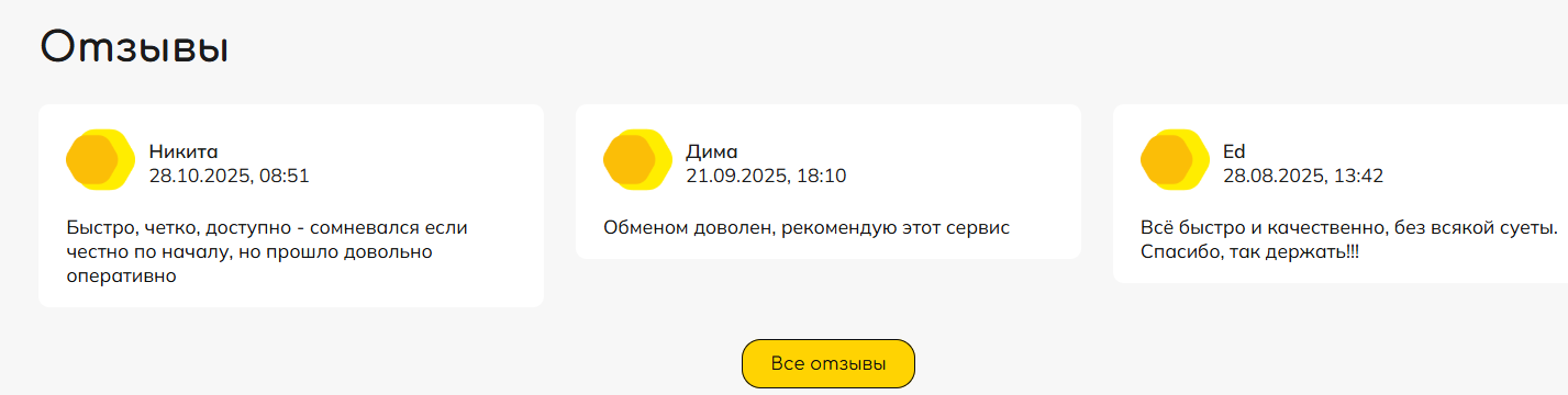 На сайте обменника выложены отзывы пользователей. Все они положительные. Но связаться с авторами комментариев невозможно: аватарки, фамилии отсутствуют, ссылок на профили в соцсетях нет, город не указан. Часто на сайтах публикуют фейковые отзывы. Поэтому гораздо надежнее читать их на независимых ресурсах: форумах, отзовиках.