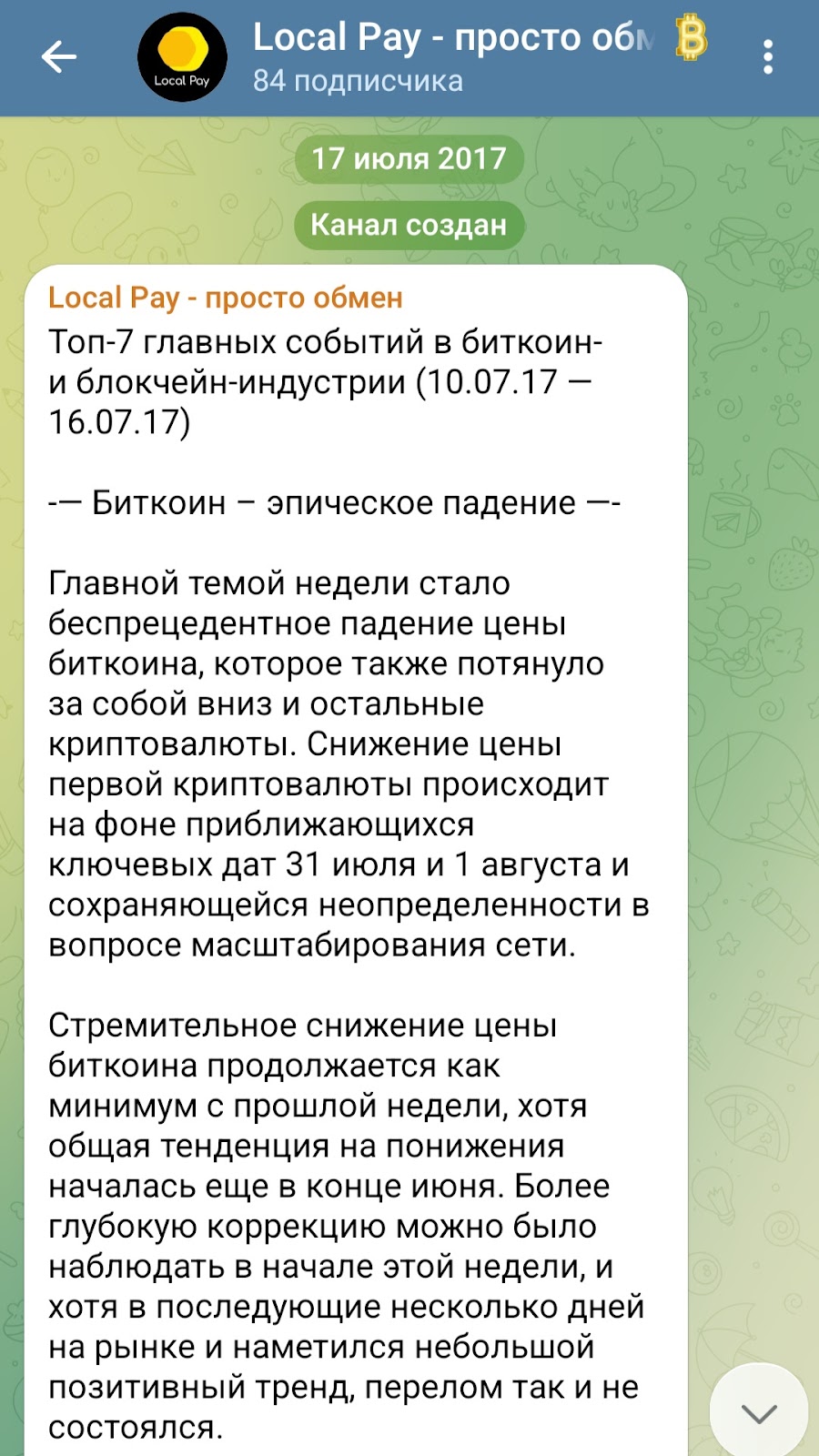 Local Pay продвигается только через Телеграмм. В мессенджере есть группа, которая называется “Local Pay просто обмен”. Она ведется с 17 июля 2017 года. По состоянию на 13 января 2026 года имеет всего 84 подписчика.