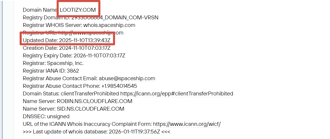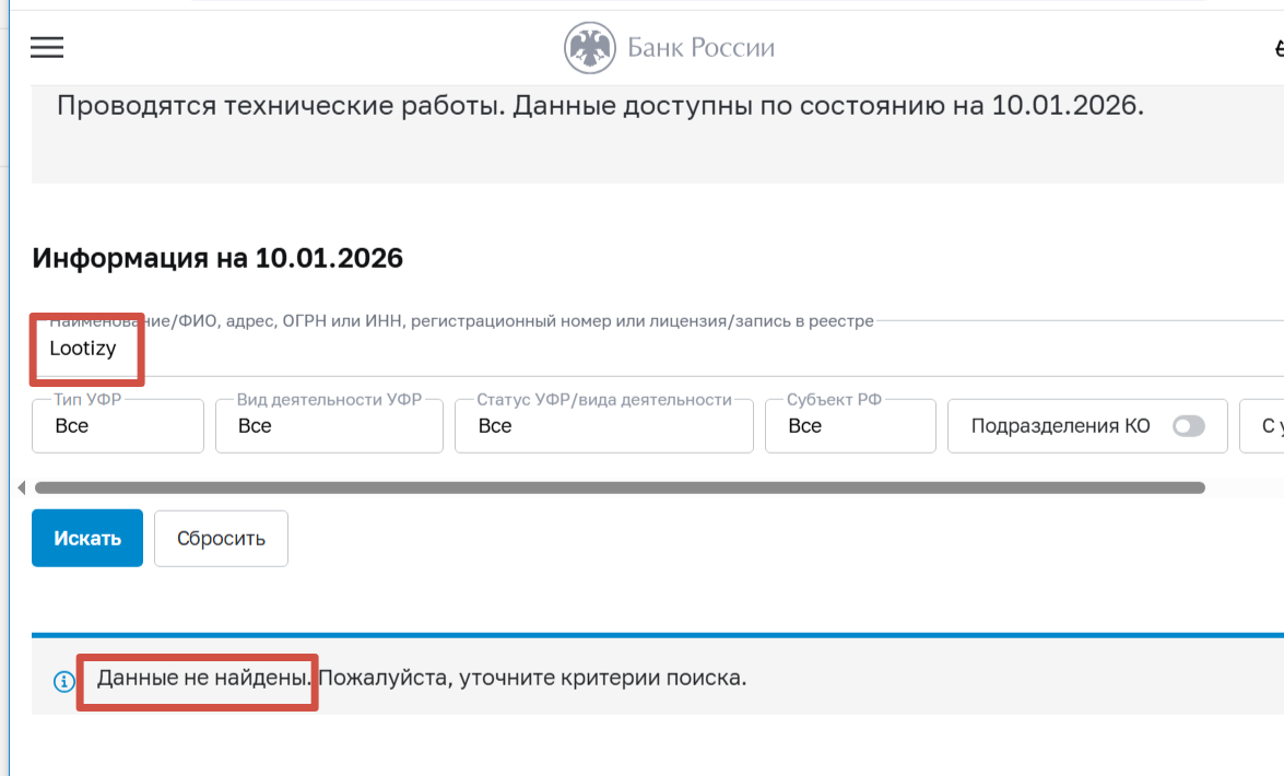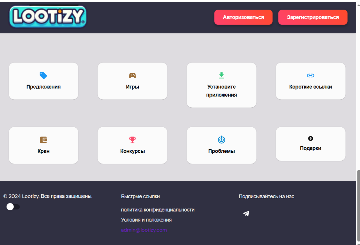 Воспользоваться предложением можно после регистрации на официальном сайте. Домен lootizy com создан в октябре 2025 года. Молодой возраст компании вкупе с агрессивным маркетингом вызывает определенные опасения.