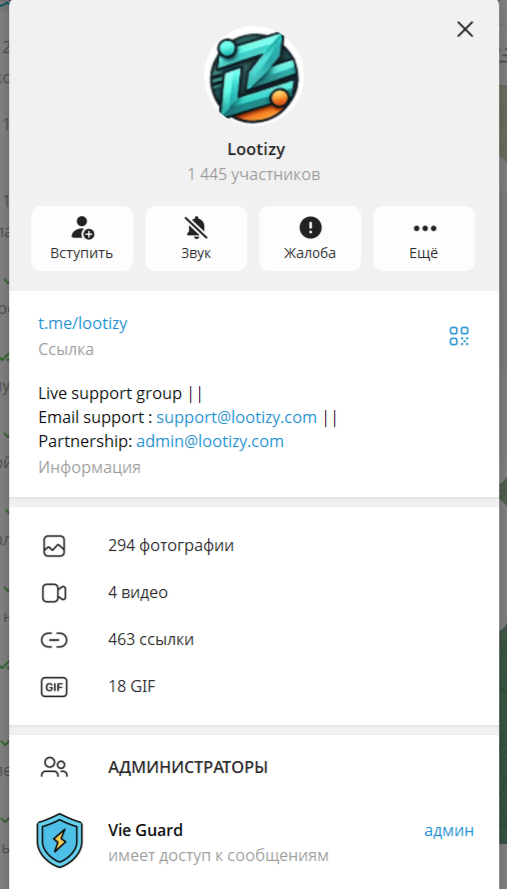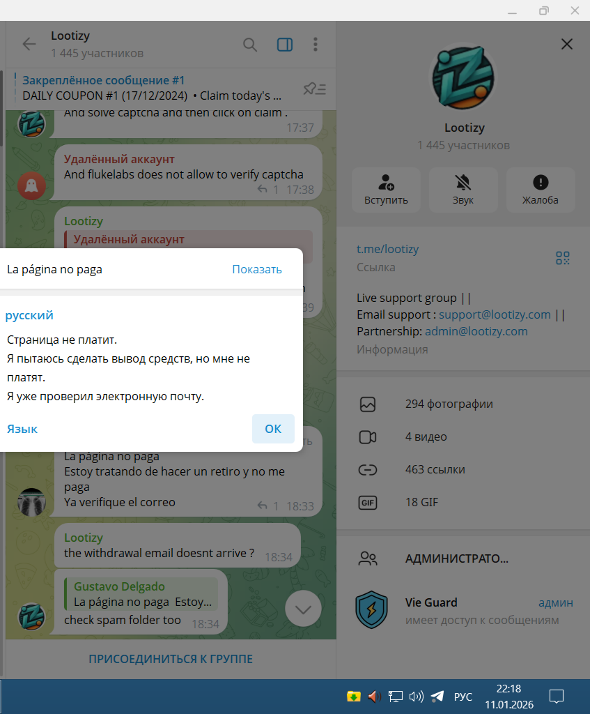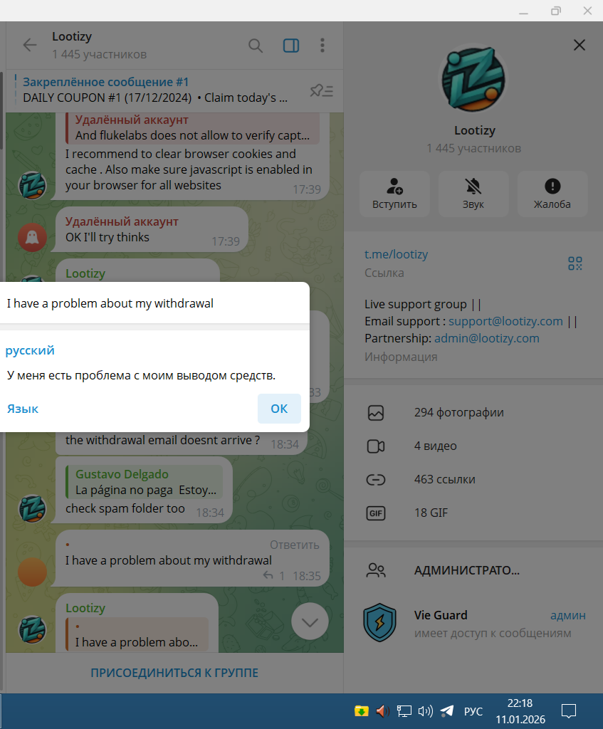 Гораздо эффективнее воспользоваться чатом в Телеграме. Аккаунт Lootizy создан около года назад. Активных пользователей насчитывает около полутора тысяч. Чаще всего пользователи жалуются на проблемы с выводом средств, активацию кодов и купонов.