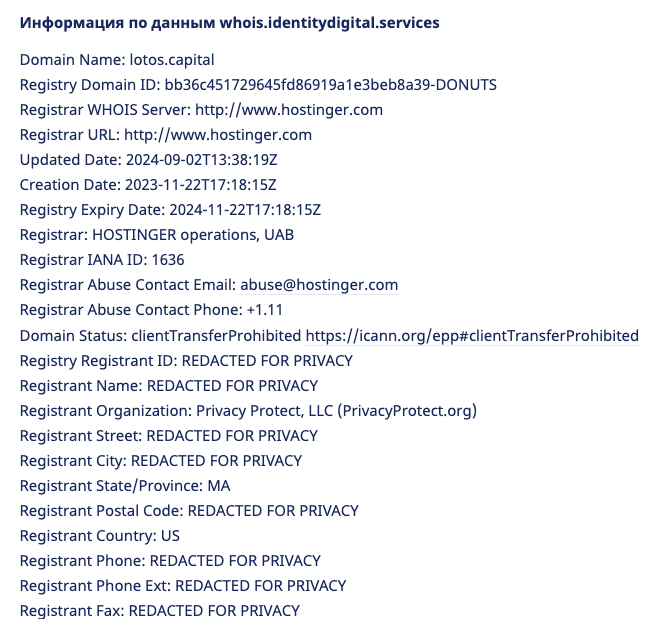 После этого мы запросили данные об этом доменном имени из сервиса Whois, в результате чего стало понятно, что он был выдан регистратором в конце ноября 2023-го года. Да, недолго, но для такой компании и год работы – это неплохо.