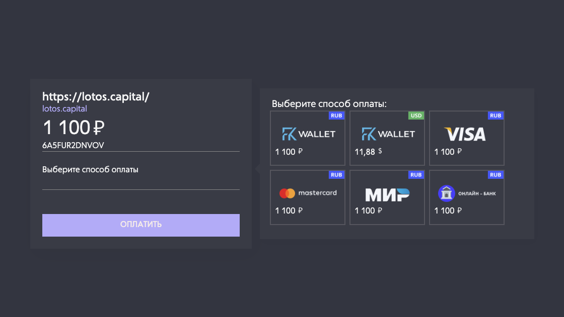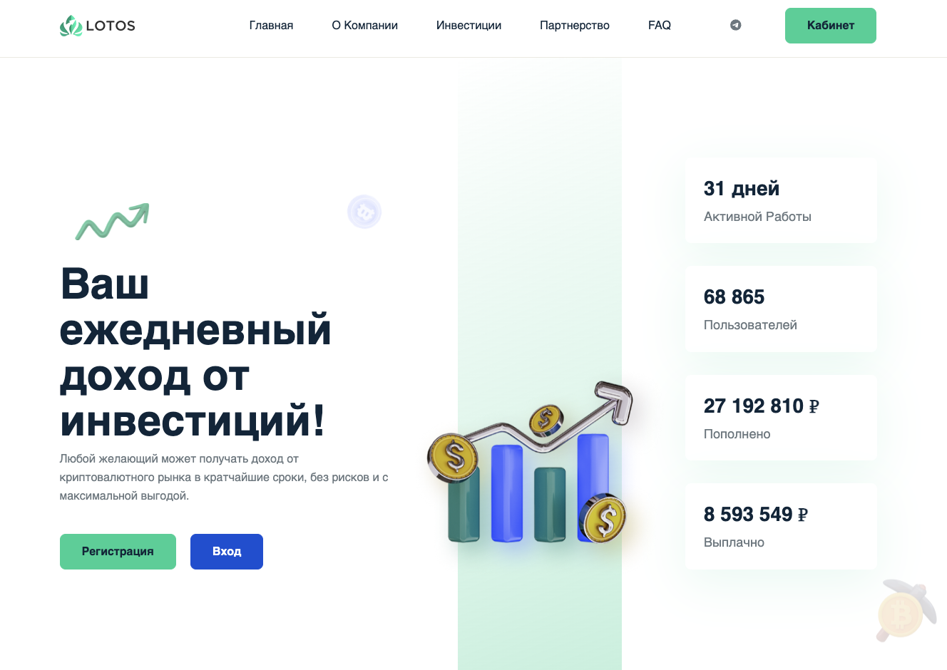 «Лотос Капитал» – площадка, на которой предлагаются инструменты, которые позволяют легко инвестировать в криптовалюты. Все, что нужно желающему получать прибыль – это сделать перевод на счет платформы и, как заявляется, ежедневно выводить деньги.