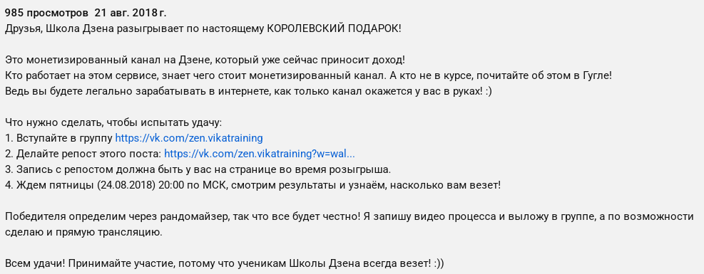 В комьюнити автор проекта объявляет рандомную раздачу призов. Она утверждает, что подарит юзеру, определенному системой случайного выбора, монетизированный Дзен-канал, который уже приносит доход. В розыгрыше могут принимать участие только лица, вступившие в ВК-сообщество и сделавшие репост публикации о лотерее.