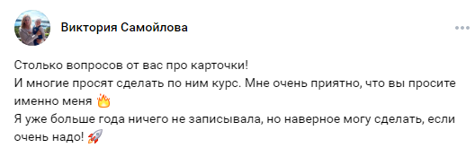 Оказывается, в настоящее время Виктория занимается совершенно другим проектами – инфографикой и дизайном. Она заявляет, что идет к успеху. Под публикациями на стене люди спрашивают, занимается ли Самойлова карточками.