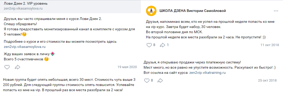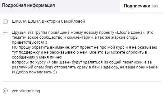 На группу в ВК Zen Vikatraining подписано 683 участника. На канале VK «Школа Дзена Виктории Самойловой» автор проекта предлагает подписчикам помочь разобраться как зарабатывать деньги в интернете. Вика организовала образовательные курсы и предоставляет их аудитории. Она обещает, что обучающая система позволит людям получать высокую прибыль.