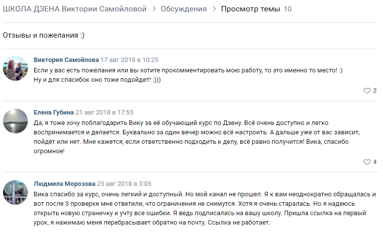 Виктория предлагает подписчикам группы ознакомиться с комментариями людей, кто покупал курс «Лови Дзен». На всеобщее обозрение представлены положительные фидбеки участников проекта.