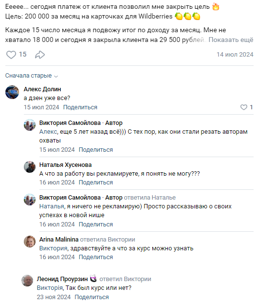 Отзывы подписчиков об организаторе комьюнити, посвященному знаниям о том, как «ловить Дзен», позволяют увидеть реальную картину. Виктория постоянно разрабатывает стартапы, утверждает, что они успешны, приглашает купить курсы по ним, но в действительности они оказываются провальными. И она меняет нишу. Возможно, она не рассчитывает делиться полезной информацией и уникальными знаниями, а настроена именно на заработок на продаже доступа к таким курсам. Потом после потока поступающих жалоб на бесполезность купленных материалов она быстро переключается на другие направления и прикрывает изживший себя источник дохода. Про каждый новый метод увеличения прибыли она восторженно говорит, что он лучший и самый эффективный. На самом деле просто пиарит скам и пытается вызвать доверительное отношение аудитории.