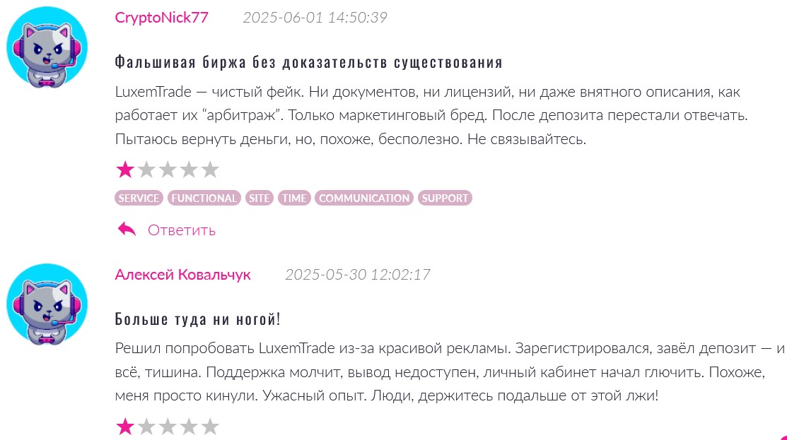 Несмотря на небольшой возраст, в интернете уже появилось несколько отзывов о Luxemtrade, все они негативные. Пользователи биржи подтверждают, что у них забирали деньги и не давали ничего выводить.