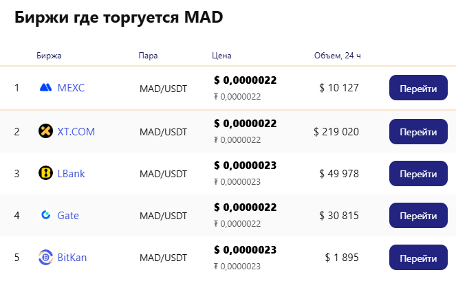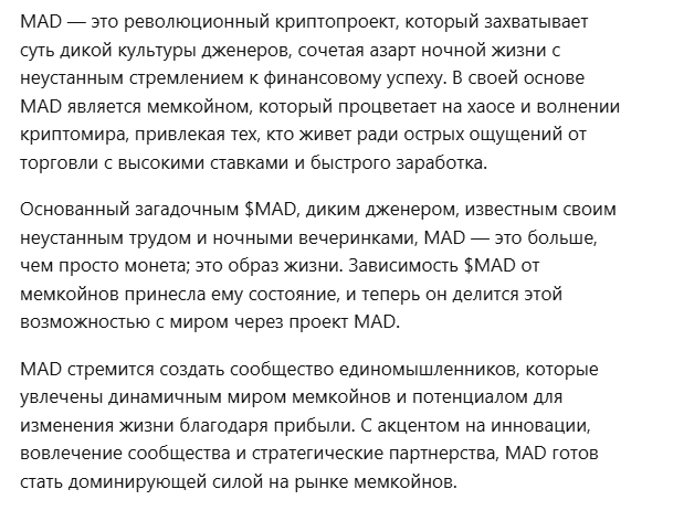 В самой монете нет ничего особенного. Она не связана с популярным мемом и не несет никакой ценности. Никто из известных личностей не поддержал $MAD. Ни на одной крупной бирже не зарегистрировано сделок по этому токену.
