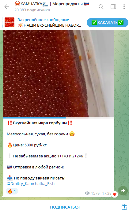 ТГ канал «Камчатка морепродукты» предлагает по оптовым ценам купить свежие и качественные морепродукты. Поставляет он их напрямую от производителя, поэтому якобы и стоимость такая низкая.